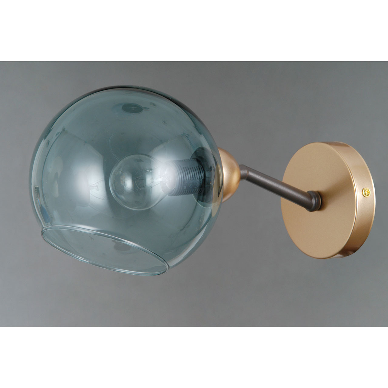 Металлическое основание настенного бра гальванизировано в цвет матового золота. Рожок бра окрашен в темно-коричневый цвет. Стеклянный плафон окрашен в массе в зелено-голубой цвет и выдувается вручную в форму. Край плафона оплавлен.