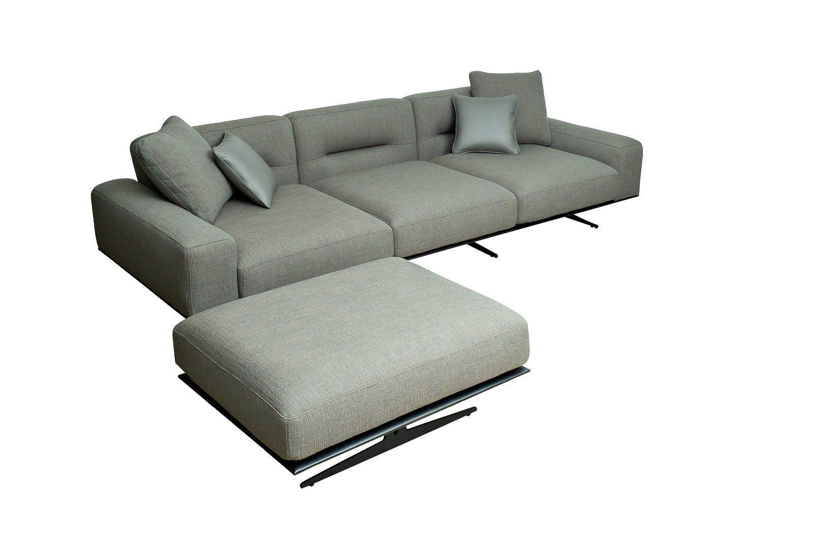 Комплект мебели №14 диван модульный PORTO (левый угол). В состав комплекта входит: основание трехместное-1шт, выполнена в иск.коже Magic01; подлокотник низкий-2шт; сиденье с высокой спинкой-3шт; отдельностоящий пуф- 1шт. Основная ткань комплекта- рогожка Norton Graphite из коллекции тканей Garda Decor. В сотав комплекта входят декоративные подушки: 50*50см с бурлетом 2шт- в ткани Norton Graphite, бурлет- иск.кожа Enzo697; 40*40см с кантом 2шт- в иск.коже Enzo 697. Металлические опоры- 170см, цвет черный. Габариты комплекта: ширина-294см, глубина- 194см, высота-75см. Глубина пуфа- 107см, глубина посадочного места- 82см, высота посадочного места- 45см