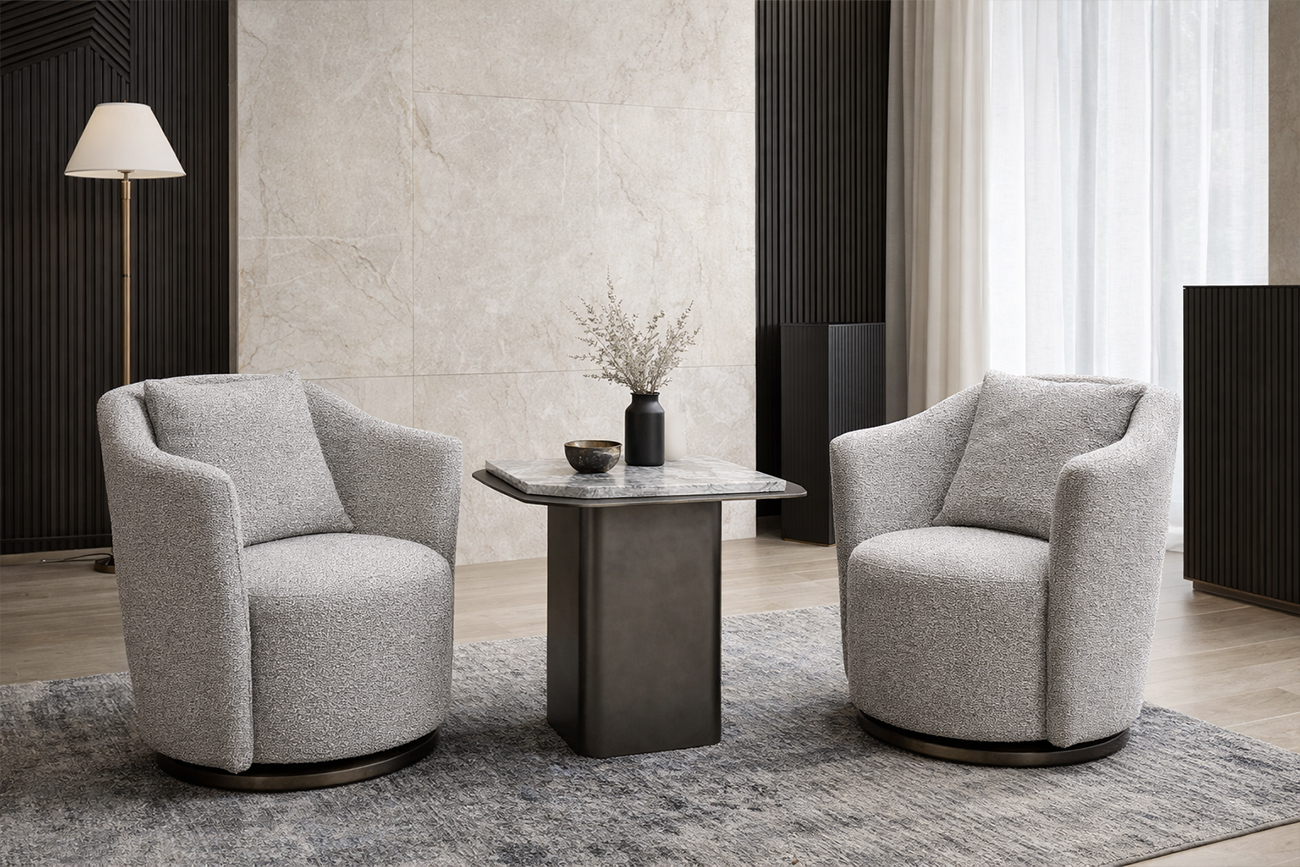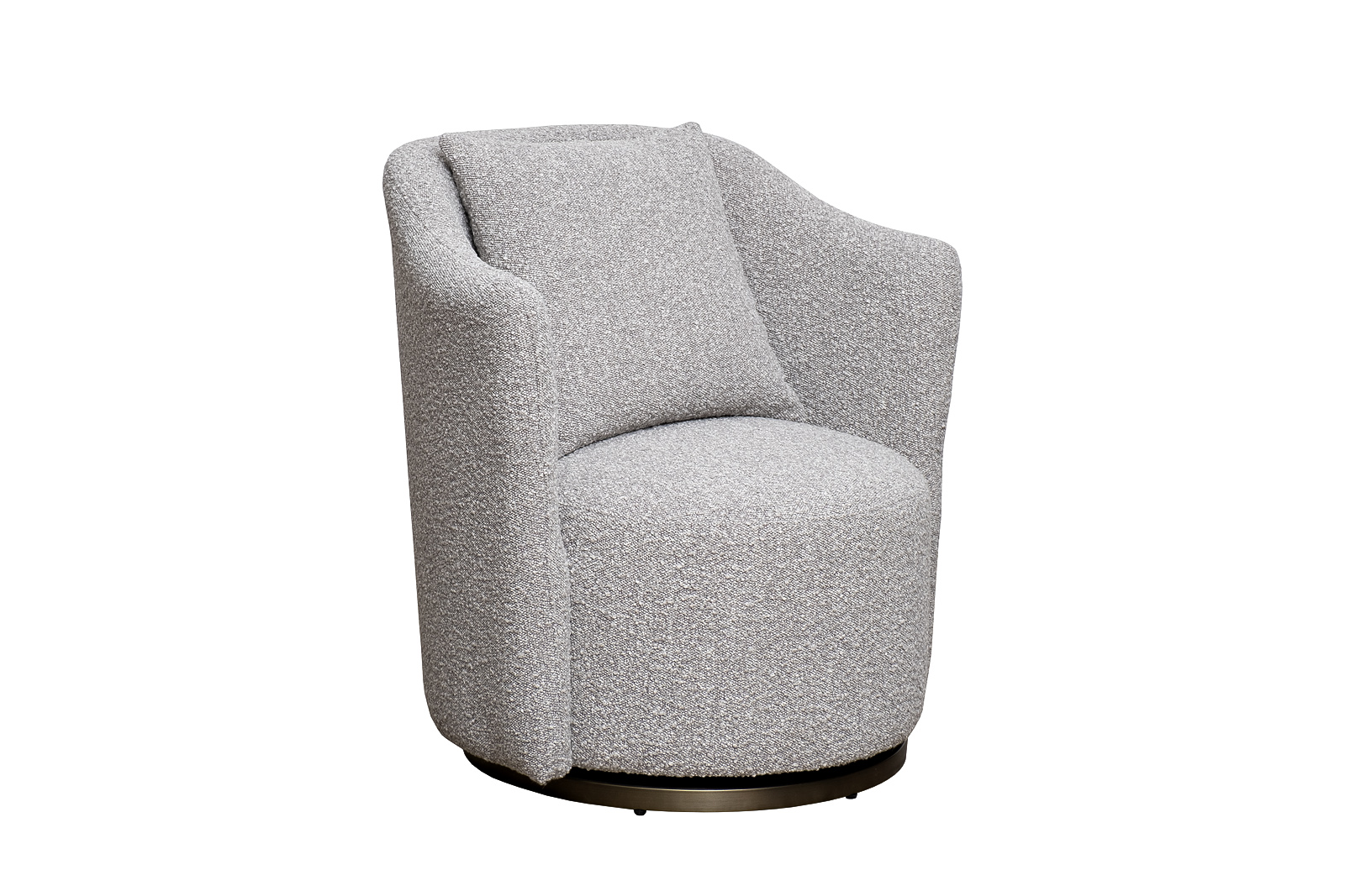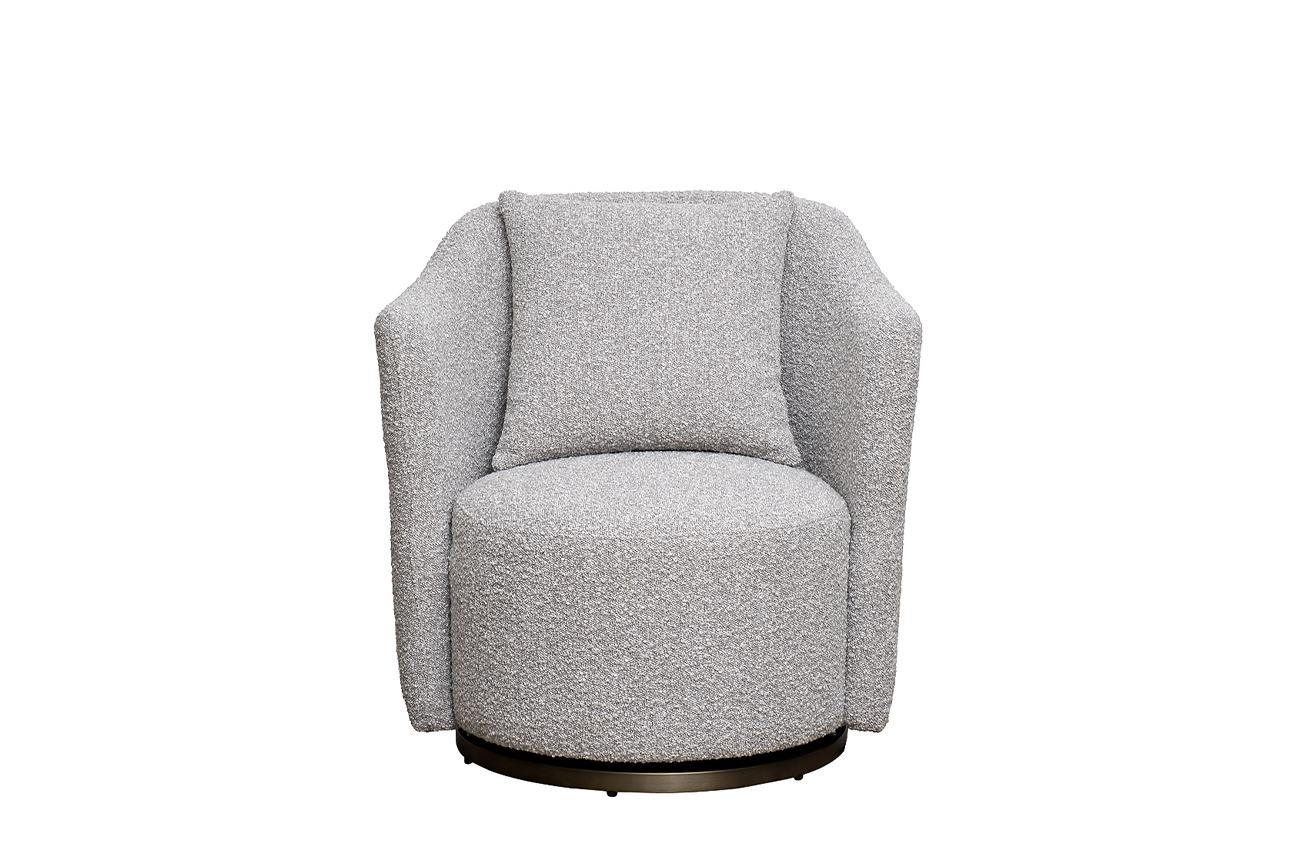 Кресло Verona — изящное воплощение уюта и современной элегантности. Вращающаяся конструкция на бронзовом основании обеспечивает комфорт в движении, а мягкое серое букле с благородной фактурой подчёркивает премиальность модели. Эргономичная спинка и объемная подушка создают обволакивающее ощущение уюта. Это кресло идеально впишется в зону отдыха, спальню или библиотеку, став стильным акцентом в интерьере. Диаметр металлической части основания - 58см, высота - 3,5см.