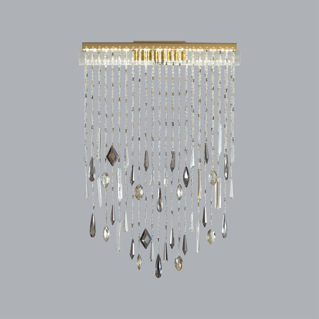 Afina - линия светильников, вдохновленная греческими мотивами. Струящиеся хрустальные нити из прозрачного, дымчатого и коньячного хрусталя создают притягательную игру переливов и отблесков. В моделях LED-источник света с цветовой температурой 3000K. В люстре предусмотрено два варианта высоты на выбор - 765 мм, либо 965 мм, высота изменяется с помощью установки штанги нужной длины, оба варианта штанги поставляются в комплекте с светильником. Плафон, через который перекинуты хрустальные нити - из прозрачного стекла.