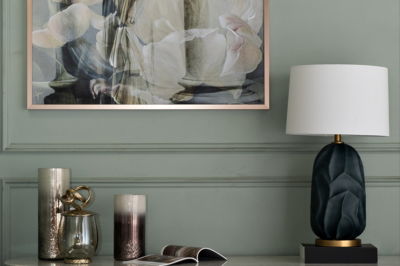 В дизайнерской настольной лампе необычное керамическое основание цвета темно-зеленого нефрита подчеркнуто металлическими элементами цвета матового золота. Изящный белый абажур классической формы делает конструкцию сбалансированной. Лампа прекрасно впишется в современный интерьер в зеленоватых, серебристо-серых и молочных тонах.