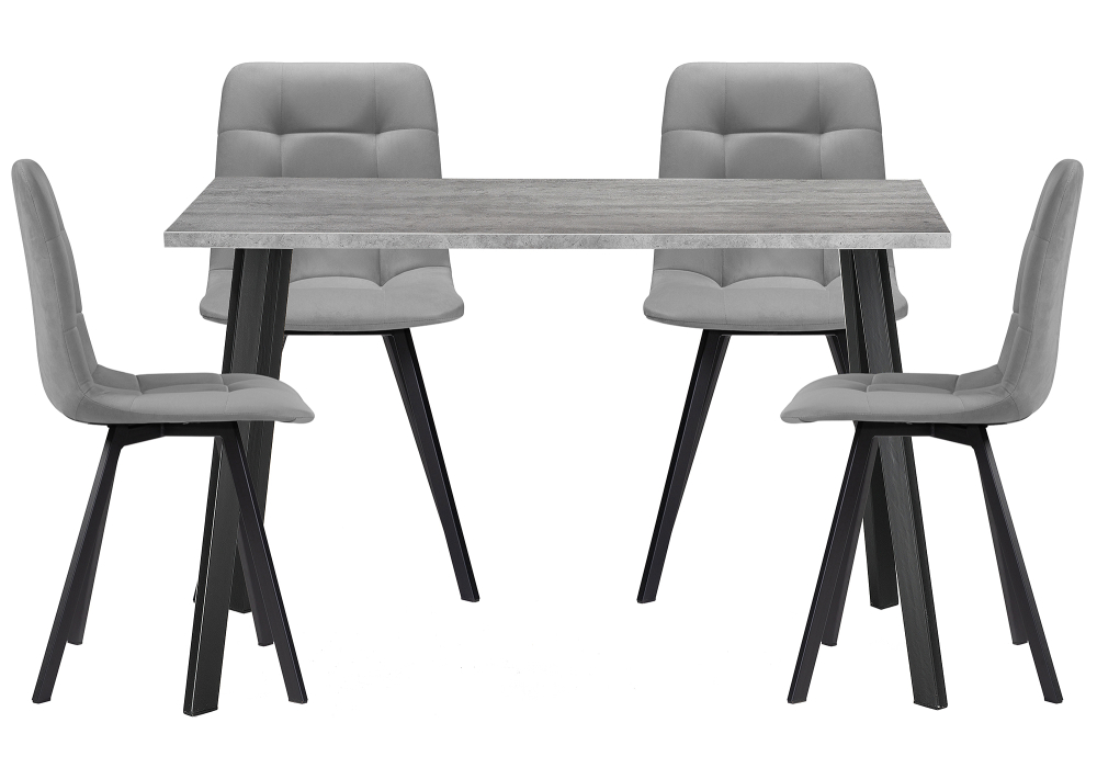 Материал каркаса - Металл; Материал сиденья - Велюр; Материал ножек - Металл; Материал столешницы - ЛДСП; Материал обивки - Велюр; Цвет каркаса - Черный; Цвет сиденья - Серый; Цвет ножек - Черный; Цвет столешницы - Серый; Цвет обивки - Серый; Ширина сиденья - 40; Глубина сиденья - 37,5; Высота сиденья - 49; Длина стола - 120; Ширина стола - 60; Высота стола - 75; Ширина стула - 43,5; Глубина стула - 50; Высота стула - 87,5;