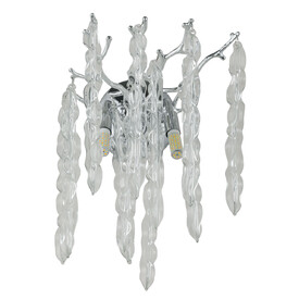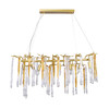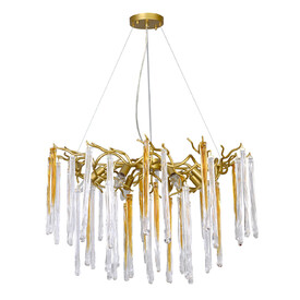 Металлическое основание подвесной люстры окрашено в цвет перламутрового золота. Люстра декорирована прозрачными стеклянными подвесками и подвесками, окрашенными в цвет карамели.
