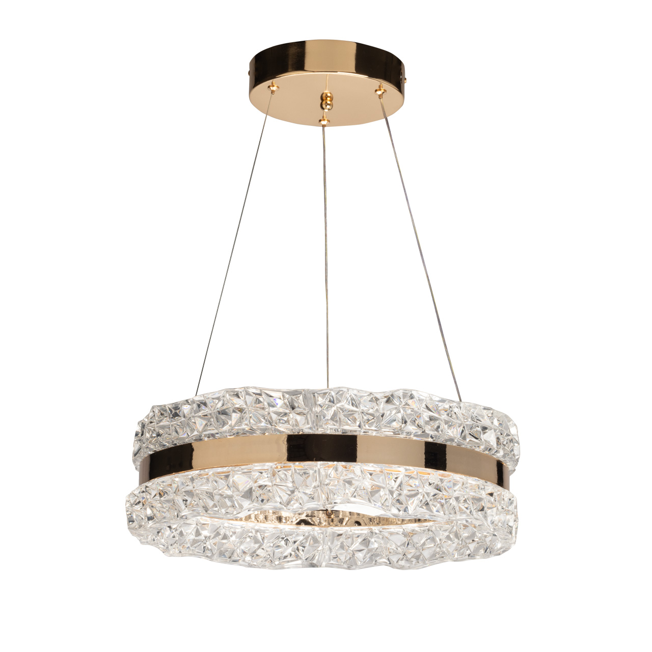 Потолочный светильник Платлинг подвешен на прочных металлических тросах, что придаёт ему лёгкость и воздушность. Общая высота светильника составляет 90 см, что делает его уместным даже в помещениях с высокими потолками. Основание светильника выполнено из качественного металла и гальванизировано в элегантный золотой цвет. Этот золотистый оттенок придаёт изделию роскошный вид и гармонично сочетается с различными стилями интерьера — от классического до современного минимализма. Плафон светильника изготовлен из фактурного акрила, который не только обеспечивает равномерное рассеивание света, но и добавляет интересные текстурные акценты в общий дизайн. Светильник Платлинг оснащён встроенными светодиодами мощностью 68W, что обеспечивает яркое и эффективное освещение. Светильник способен осветить помещение площадью до 19 квадратных метров, что делает его идеальным решением для гостиных, кухонь или детских. Светодиоды отличаются долговечностью и экономичностью, что позволяет значительно сократить расходы на электроэнергию по сравнению с традиционными лампами. Светильник оснащен пультом, что дает возможность регулировать температуру света от 3000-6000 K.Лаконичный и современный дизайн светильника Платлинг соответствует актуальным тенденциям в мире освещения. Простота форм и отсутствие лишних деталей делают его универсальным элементом, который легко вписывается в любой интерьер. Светильник может использоваться как самостоятельный источник света, так и в сочетании с другими осветительными приборами, создавая гармоничное освещение в пространстве.
