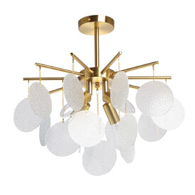 Металлическое основание подвесной люстры гальванизировано в цвет золота. Люстра декорирована матированными стеклянными элементами в форме листьев, а также бусами с имитацией жемчуга.