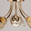 Металлическое основание потолочной люстры гальванизировано в цвет золота. Стеклянные плафоны гальванизированы в цвет шампань. Люстра декорирована прозрачным хрустальным стеклом.