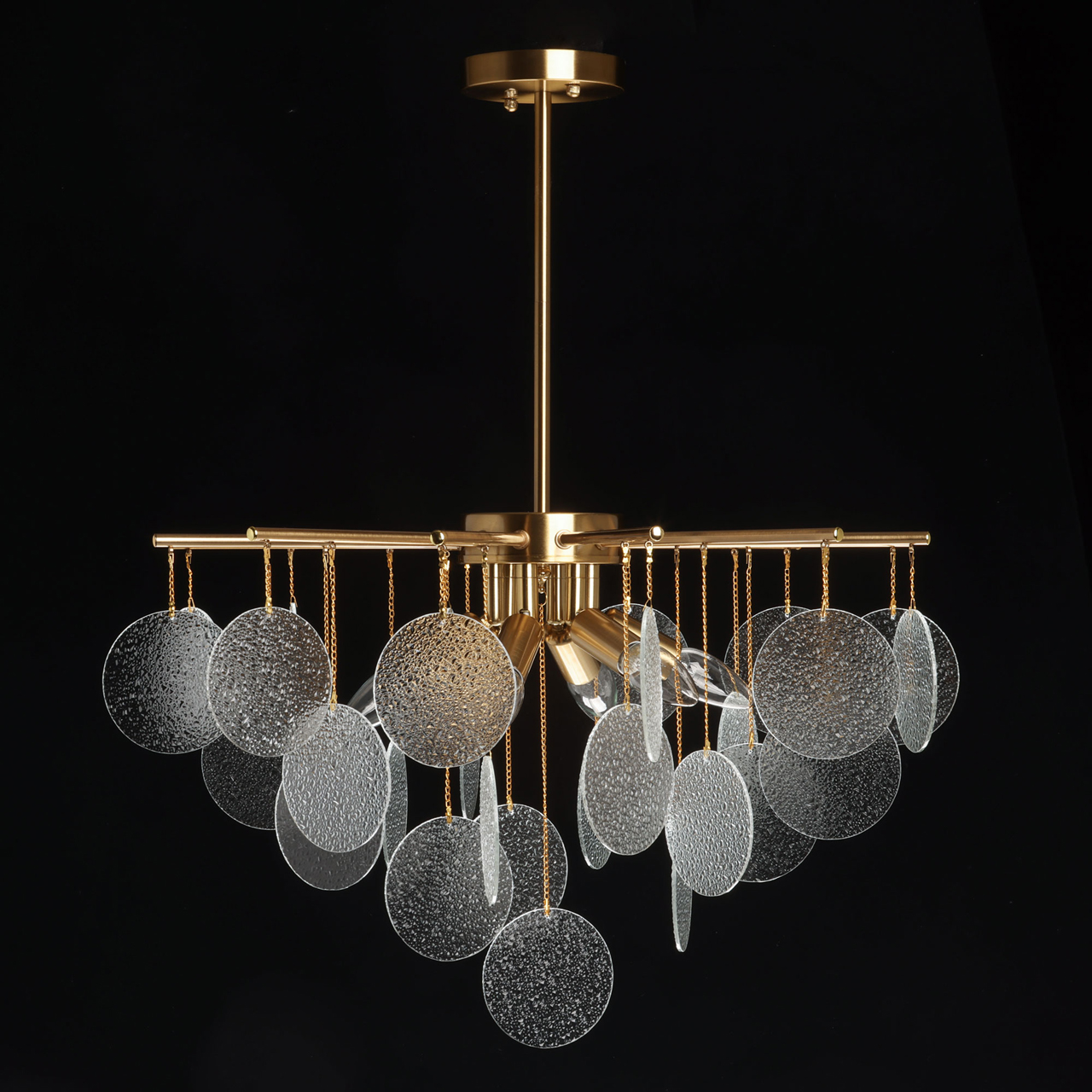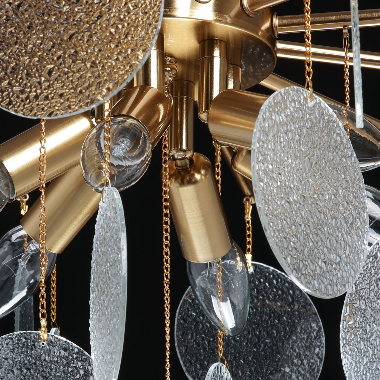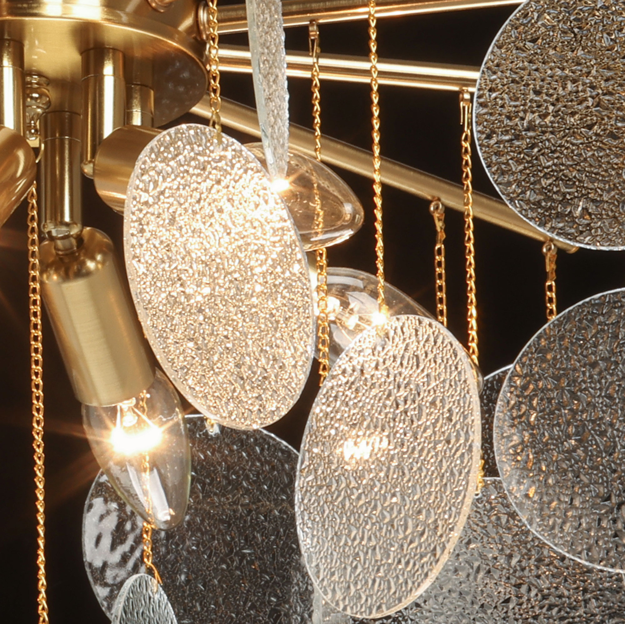 Металлическое основание подвесной люстры гальванизировано в цвет латуни. Люстра декорирована подвесками из фактурного полупрозрачного стекла.