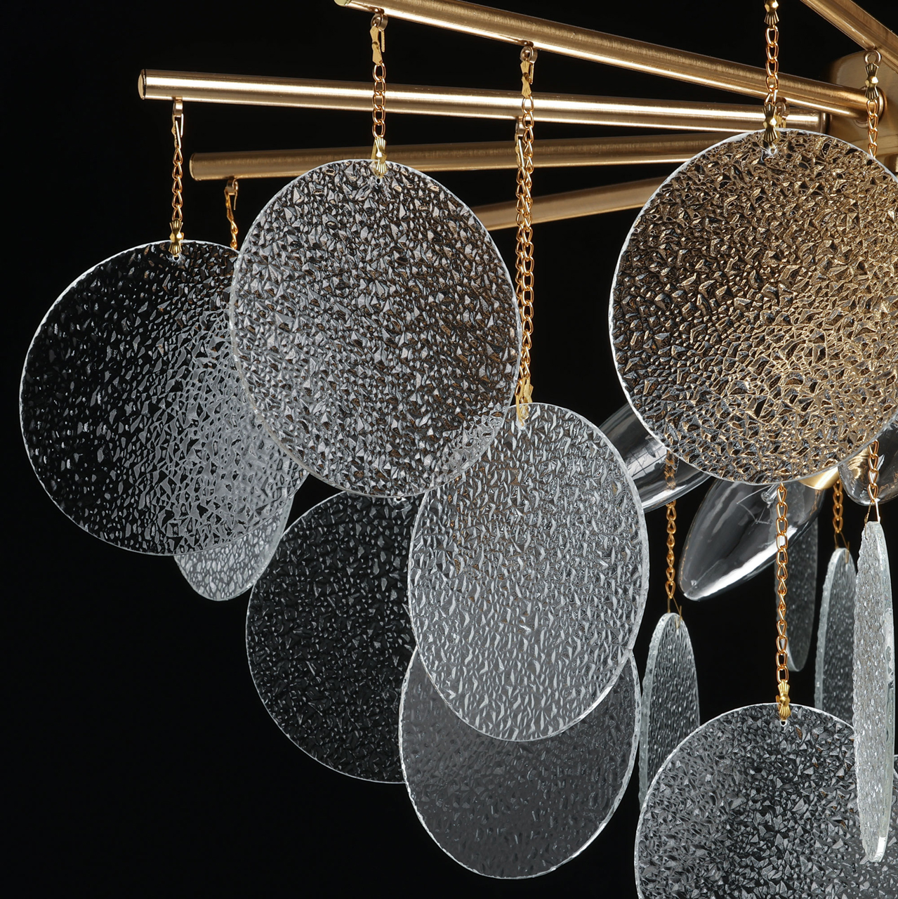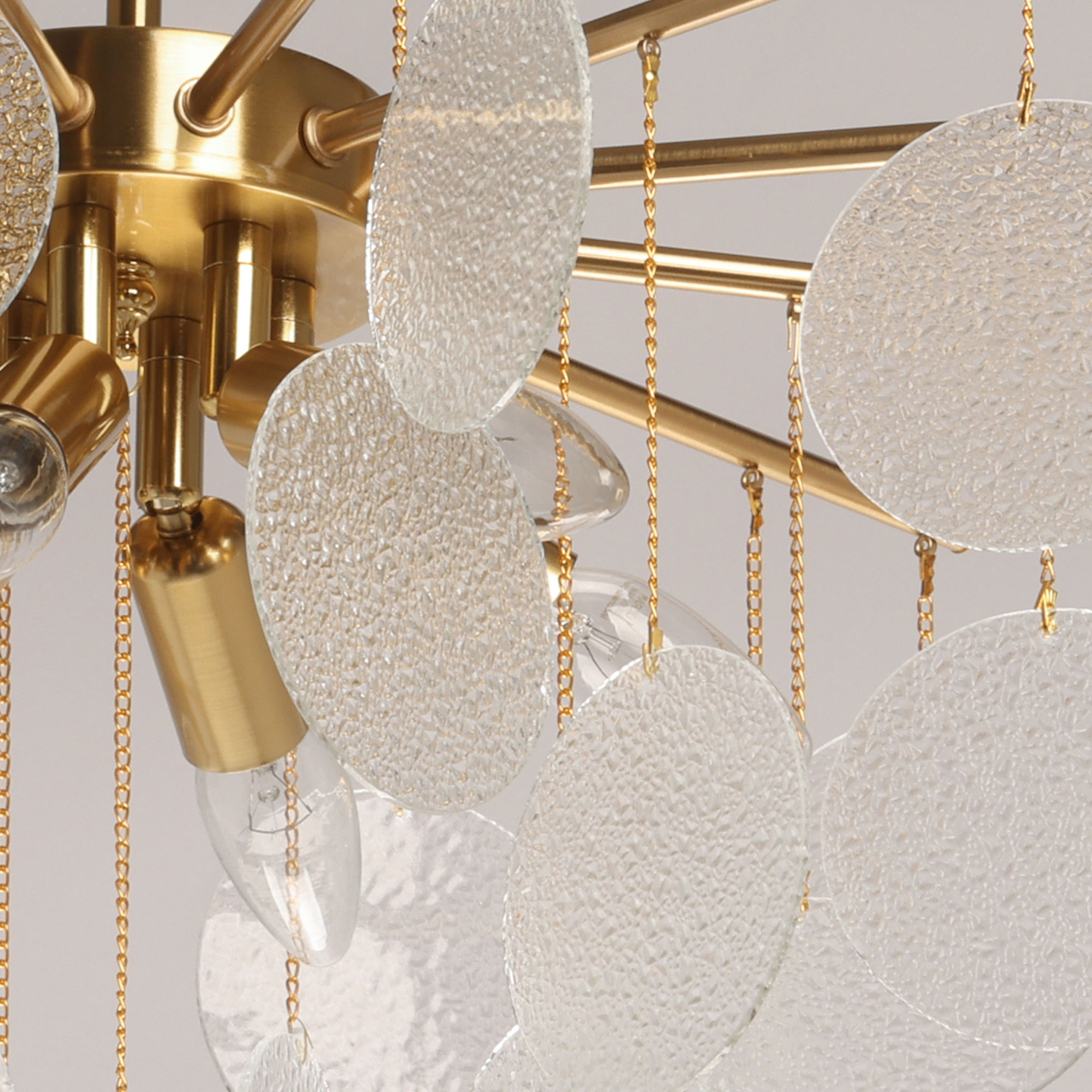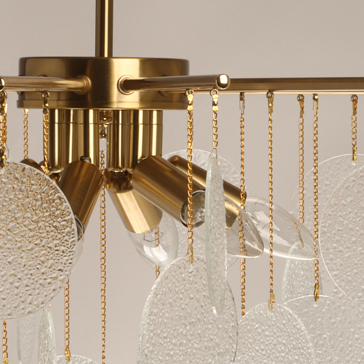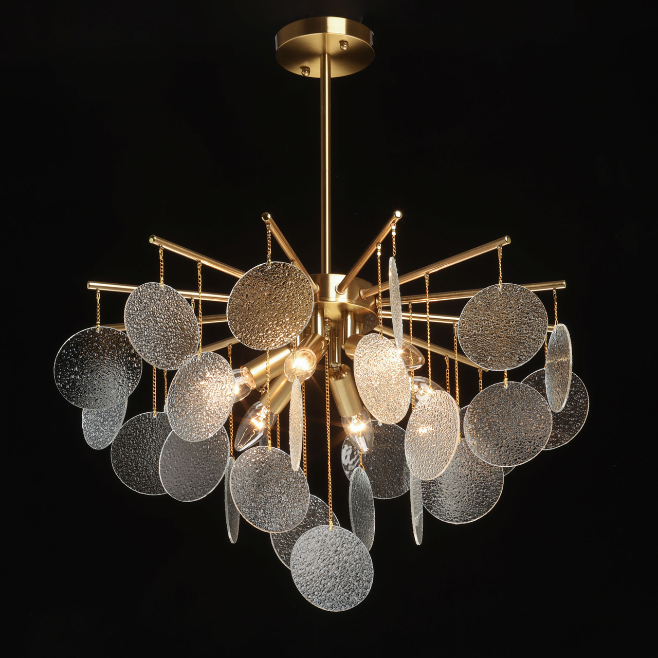 Металлическое основание подвесной люстры гальванизировано в цвет латуни. Люстра декорирована подвесками из фактурного полупрозрачного стекла.