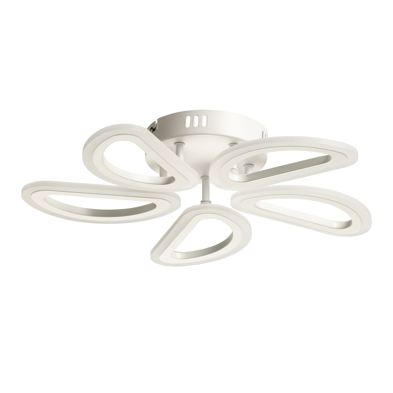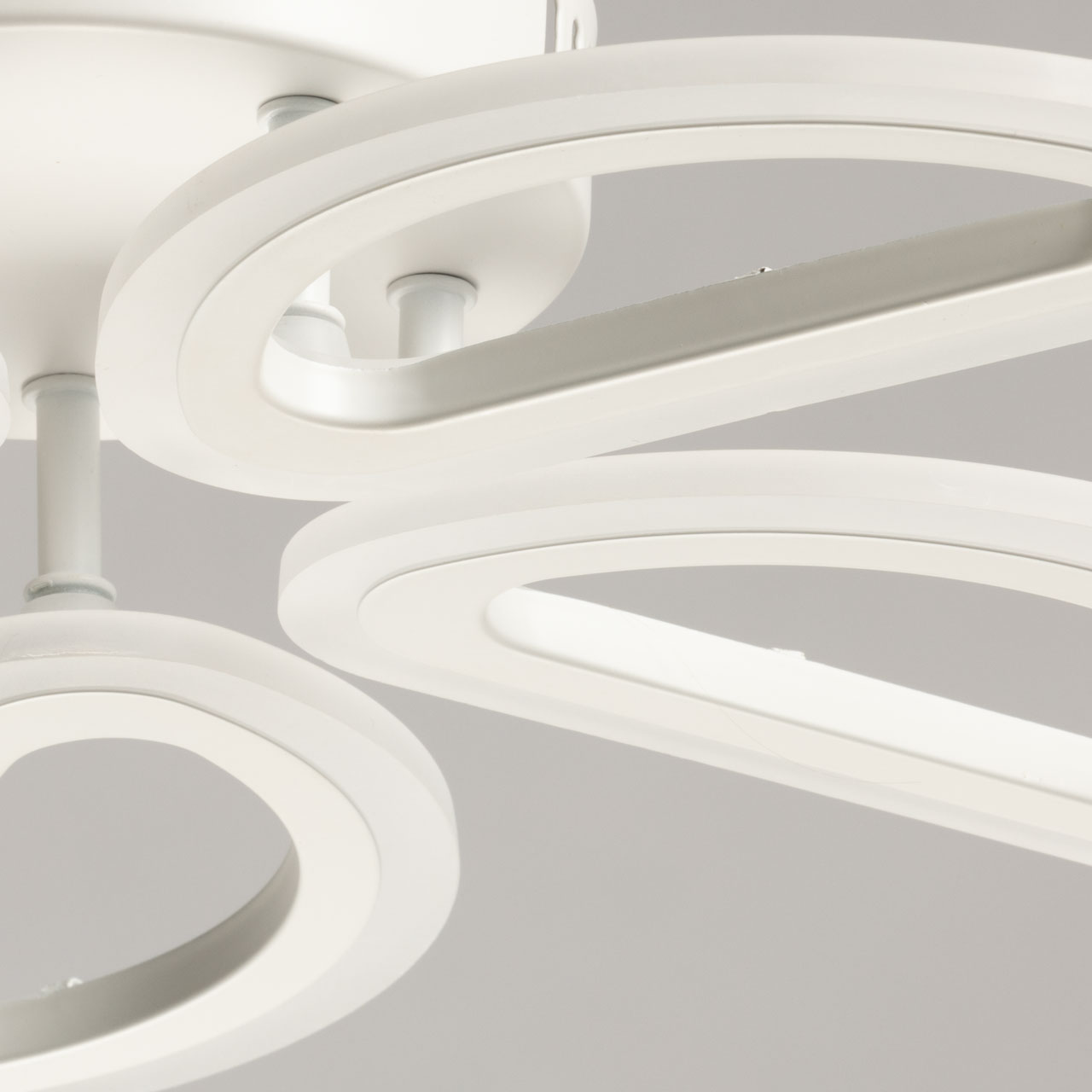 Металлическое основание потолочной люстры окрашено в белый цвет. Корпус плафонов выполнен из сплава алюминия с цинком и окрашен в цвет основания. Светодиодные источники света закрыты белым матовым акрилом.