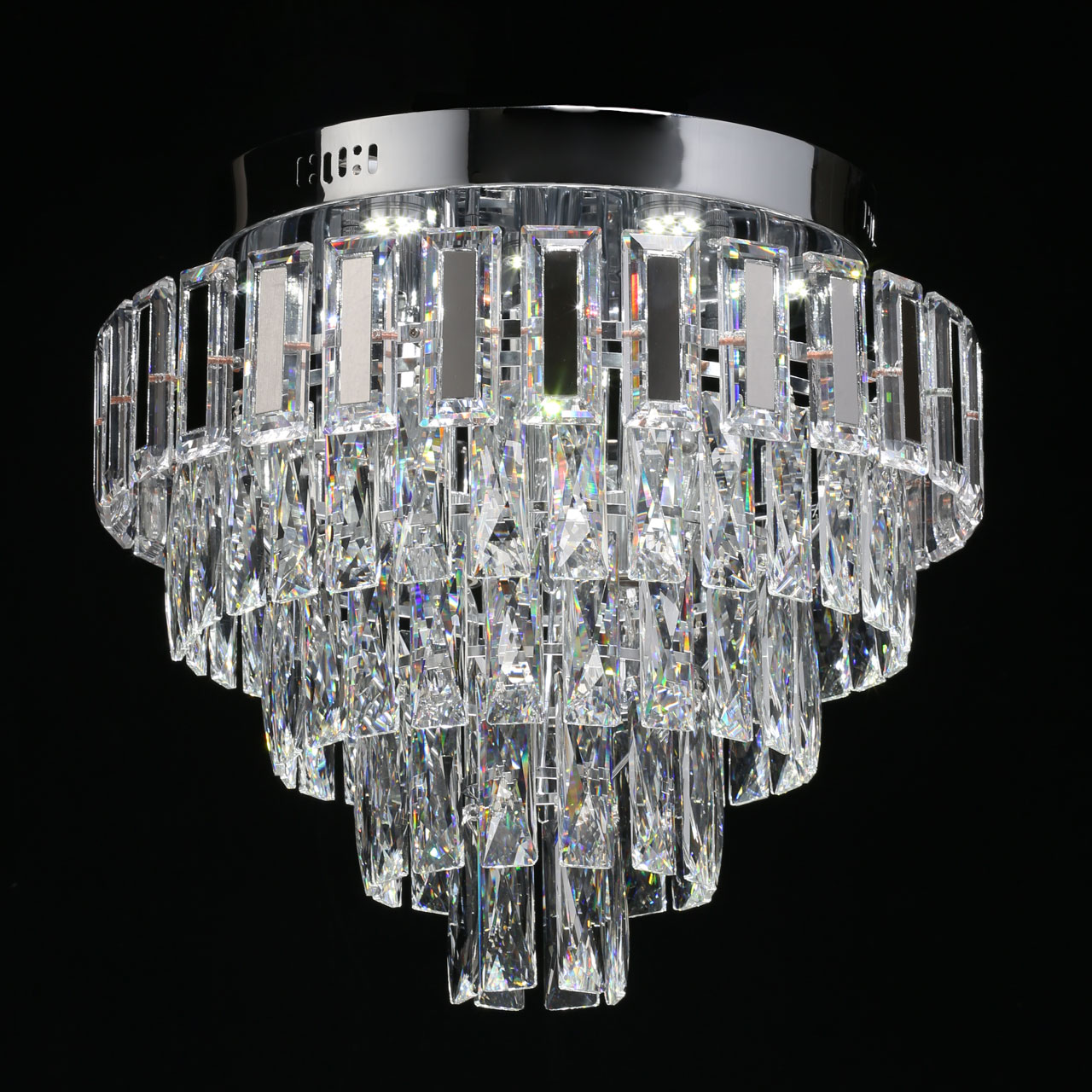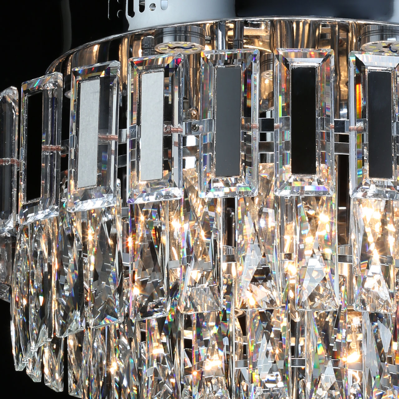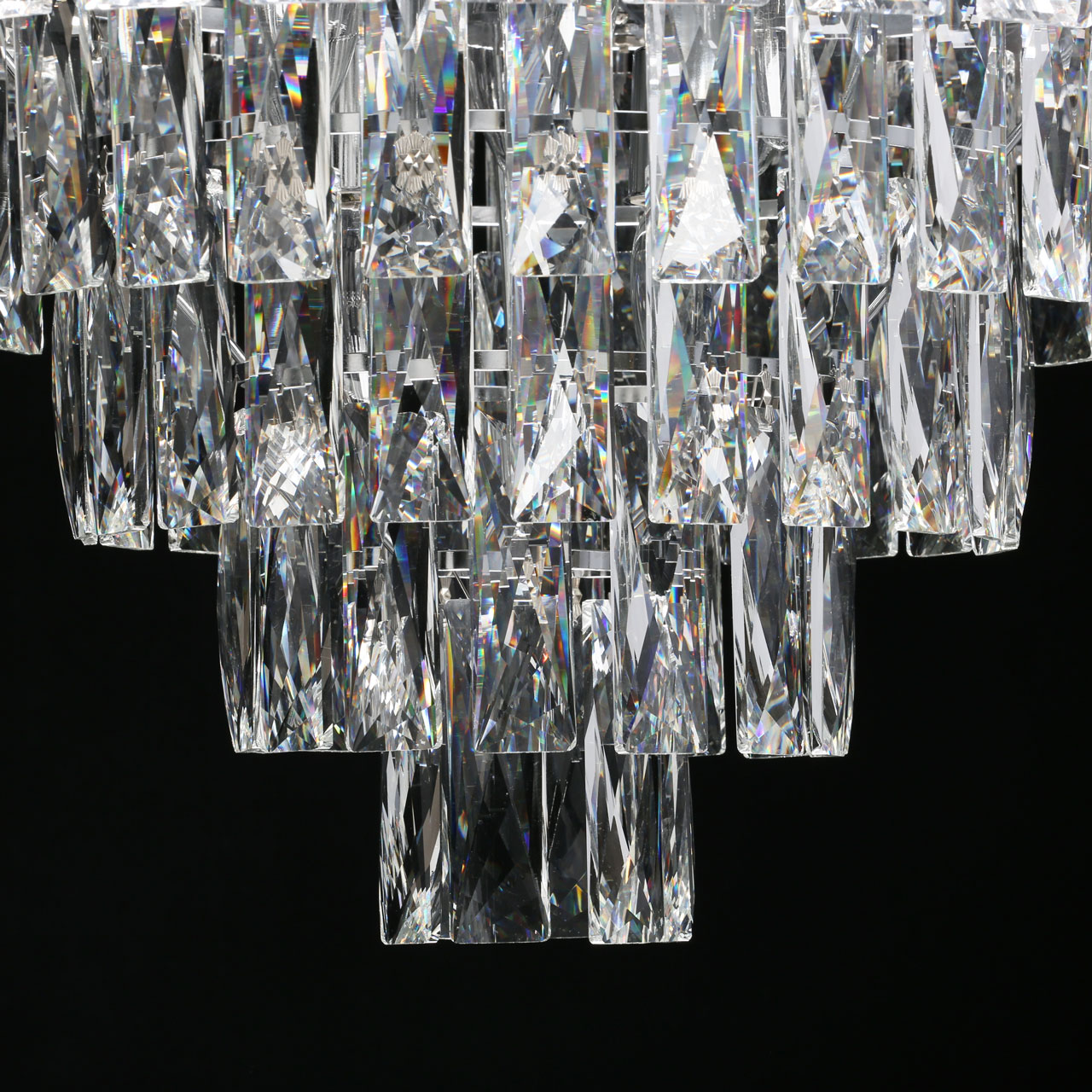 Металлическое основание светильника гальванизировано в цвет хрома. Светильник декорирован хрусталем прямоугольной формы. Верхний ярус хрусталя декорирован пластинами из нержавеющей стали, отполированной до зеркального блеска.