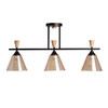 Металлическое основание потолочной люстры окрашено в черный цвет. Стеклянные плафоны отлиты в фактурную форму и гальванизированы в цвет коньяка. Потолочная люстра декорирована элементами из светлого натурального дерева.