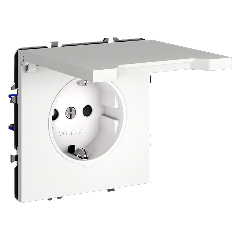 Купить "Розетка встраиваемая с заземлением, защитными шторками и крышкой 16А Voltum S70 VLS040302 (белый матовый)"