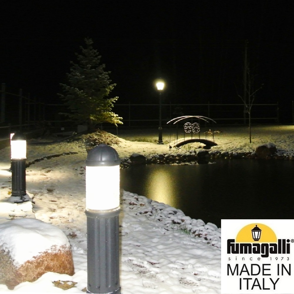 Садовый светильник-столбик FUMAGALLI серии SAURO, модель SAURO 1100 - изготовлены в Италии. Используются для освещения парковых дорожек, газонов, парковок, набережных, как элементы ландшафтного и светового дизайна. Корпус изготовлен из современного вандалостойкого, негорючего полимера RESIN. Прочного, окрашенного в массе, не ржавеющего, не выгорающего на солнце, не проводящего электричество. Все светильники пыле-влаго защищены по стандарту IP55. Рассеиватель выполнен из толстого антивандального, не мутнеющего и не горючего PMMA (ПолиМетилМетаАкрилат). Срок службы светильника - не менее 20 лет, в течении которого парковый светильник не нужно красить и как либо обслуживать. Температура эксплуатации от -60 до +90. При заказе требуется выбрать цвет корпуса, цвет плафона и тип патрона. Серия SAURO включает в себя светильники высотой 0,50 метра, 0,80 метра, 1,10 метра, а так же уличный светильник MIRELLA с установкой на стену. Дополнительно можно использовать столбики- ограждения NARDO высотой 60 и 90 сантиметров. Между столбиков можно натягивать цепочку. Также светильник-столбик с цоколем Е27, может комплектоваться хромированным или белым рассеивателем на лампу. Закладные крепежные элементы паркового столба SAURO - в комплекте.