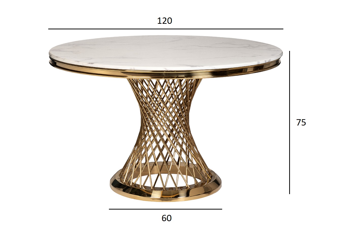 Стильный круглый обеденный стол сочетает в себе благородство мраморной столешницы и роскошь основы из позолоченного металла. За счет такого сочетания модель выглядит элегантно и добавляет шика обстановке. Обеденный стол из искусственного мрамора будет эффектно смотреться в современной столовой и на кухне, оформленной в стилистике ар-деко, неоклассика. Изюминка модели – основание необычного дизайна из переплетенных металлических прутьев. Композицию гармонично дополняет столешница из искусственного камня. Мебель отличается безупречным качеством и органично вписывается в современную обстановку. Купить стол из мрамора можно на сайте Garda Decor с доставкой по Москве и РФ.