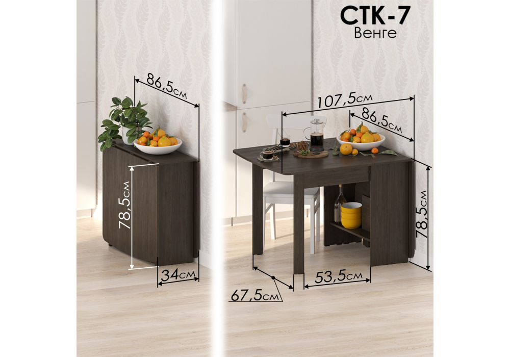 Материал каркаса - ЛДСП; Материал столешницы - ЛДСП; Цвет каркаса - Венге; Цвет столешницы - Венге; Ширина - 34,2 - 86,6; Высота - 78,5; Длина - 86,6 - 240,6;