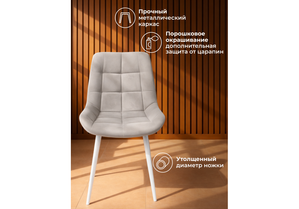 Материал каркаса - металл; Материал сиденья - велюр; Материал обивки - велюр; Цвет ножек - белый; Ширина - 50; Глубина - 60; Высота - 80; Ширина сиденья - 44; Глубина сиденья - 41; Высота сиденья - 48;